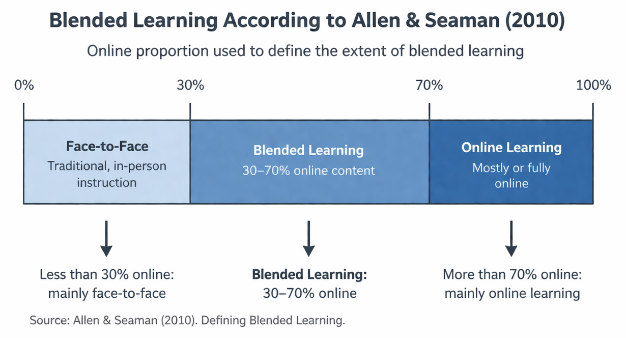 Allen and Seaman (2010) approached the concept from a purely quantitative angle, defining Blended Learning as any course where between 30 and 70 per cent of instruction takes place online. This percentage-based view reduces a complex educational question to a simple ratio. It tells us nothing about what happens during those online or face-to-face hours, or whether they connect meaningfully at all.
