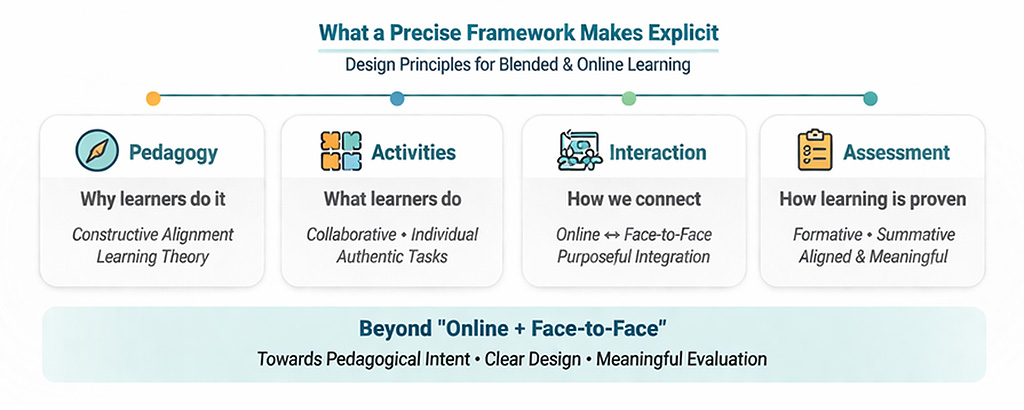 What these approaches share is a shift away from describing the format — online plus face-to-face — towards describing the pedagogical intent. That is the right direction. A framework worth the name should be specific enough to guide decisions, distinguish between good and poor design, and support meaningful evaluation. Blended Learning, as currently defined, does not reliably do any of these things.