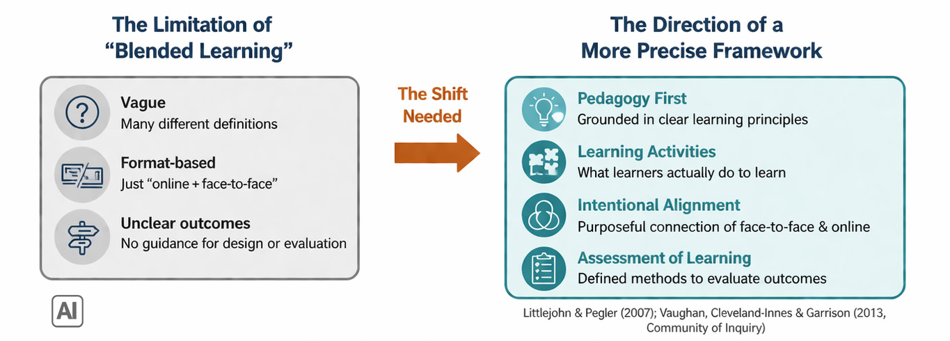 The core problem is straightforward: Blended Learning is too broad to guide educational design with any precision. It accommodates too many approaches, prescribes too little, and has become too closely tied to institutional branding and policy rhetoric. The term tells us what format a course uses — some online, some face-to-face — but says almost nothing about how or why.